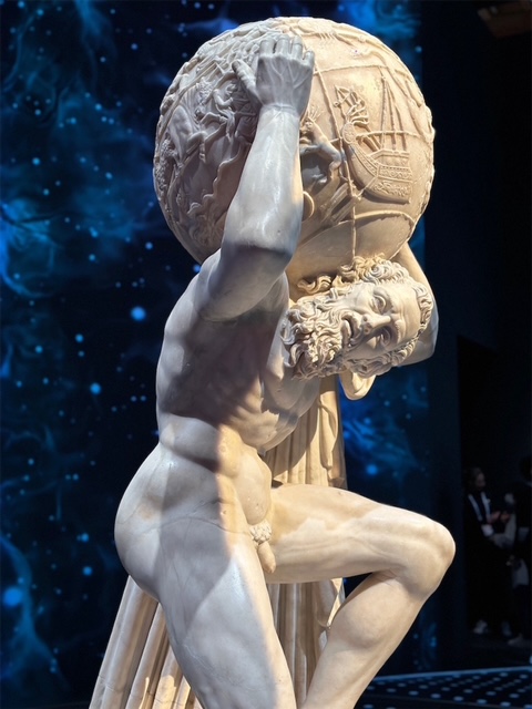 日本初展示される世界的な文化遺産として知られるギリシャ神話アトラスが体を丸めて天球儀を肩に担ぐ姿の『ファルネーゼのアトラス』